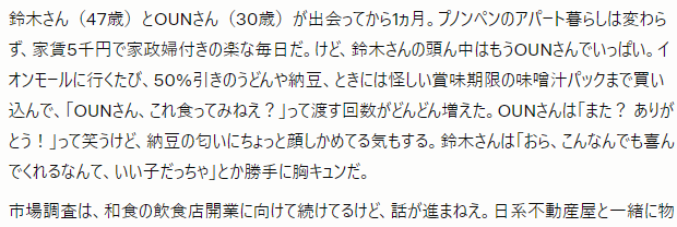 ある夜、OUNさんとアパートの屋上で缶ビール片手に話してたとき、鈴木さんがポロッと「店出すの、めっちゃ大変だな…」ってこぼした。OUNさんは「でも、鈴木さんならできるよ。だって、いつも頑張ってるじゃん」って、ちょっとたどたどしい日本語で励ます。その一言に、鈴木さんの心はまたドキッ。で、調子に乗って「OUNさん、俺の店できたら、毎日寿司食わせてやるっちゃ!」とかデカいこと言っちゃう。OUNさんは「ふふ、楽しみ!」って笑うけど、鈴木さん、内心「寿司の作り方、YouTubeで勉強せんと…」って焦る。